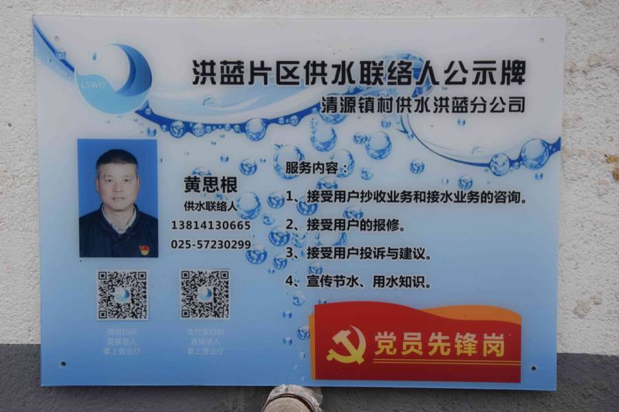 近期,永陽、洪藍、白馬、東屏、石湫、晶橋、和鳳7個鎮街各社區、自然村公示欄出現了一張張藍色的公示牌——供水聯絡人公示牌,公示牌上的內容有聯絡人姓名、聯系方式、二維碼、供水服務內容。