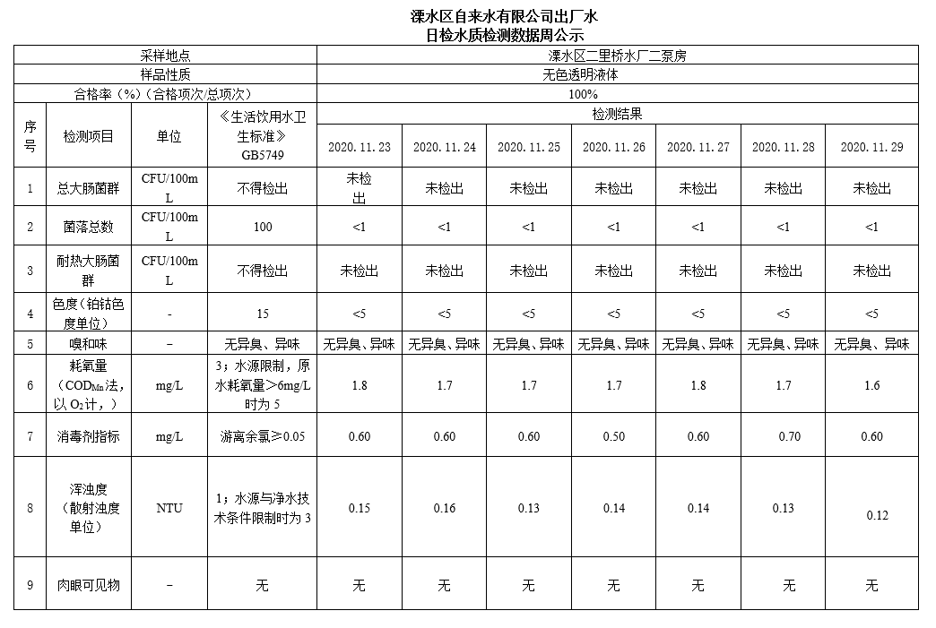 出廠水每周公示2020.12.1 時(shí)間:2020-12-01 分類(lèi):水質(zhì)公示 上一篇: 管網(wǎng)水(半月度公示2020.12.1) 下一篇: 出廠水每周公示(2020.12.8) 相關(guān)文章 2025.9.23管網(wǎng)水(月全) 2025.9.23出廠水、管網(wǎng)末梢水常規(guī)42項(xiàng)指標(biāo)(月度公示) 2025.9.4管網(wǎng)末梢、管網(wǎng)水(半月) 出廠水每周公示2025.10.13-2025.10.19 出廠水每周公示2025.10.6-2025.10.12 出廠水每周公示2025.9.29-2025.10.5 出廠水每周公示2025.9.22-2025.9.28 出廠水每周公示2025.9.15-2025.9.21