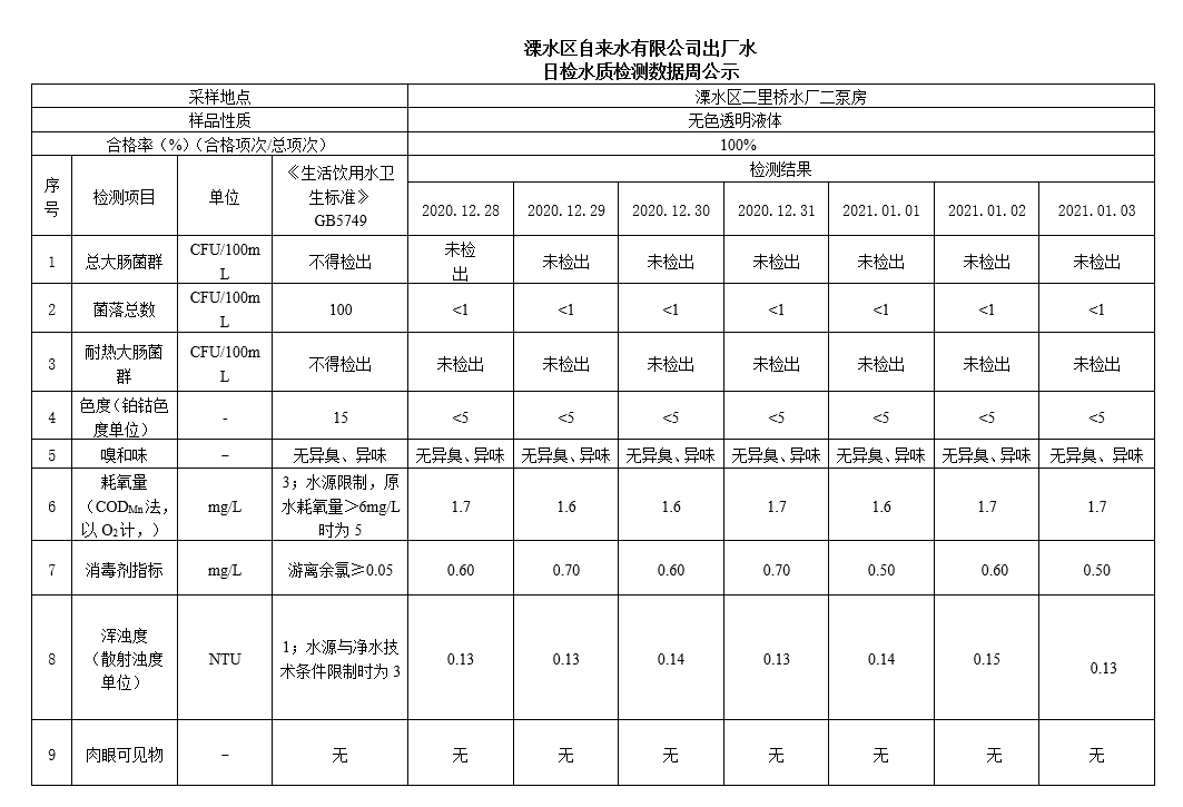 出廠水每周公示2021.01.05 時間:2021-01-05 分類:水質(zhì)公示 上一篇: 出廠水每周公示(2020.12.29) 下一篇: 出廠水每周公示2021.12.27-2022.1.2 相關(guān)文章 2025.9.23管網(wǎng)水(月全) 2025.9.23出廠水、管網(wǎng)末梢水常規(guī)42項指標(biāo)(月度公示) 2025.9.4管網(wǎng)末梢、管網(wǎng)水(半月) 出廠水每周公示2025.10.13-2025.10.19 出廠水每周公示2025.10.6-2025.10.12 出廠水每周公示2025.9.29-2025.10.5 出廠水每周公示2025.9.22-2025.9.28 出廠水每周公示2025.9.15-2025.9.21