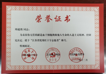 近日,省紅十字會、省文明辦、團省委聯合發文,表彰2021年12月以來成功實現造血干細胞捐獻的同志并授予“江蘇省優秀紅十字志愿者”稱號。我集團職工周超然同志獲此殊榮。